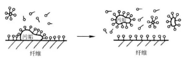 洗涤作用较复杂,是表面活性剂的润湿、乳化、分散、增溶等综合作用以及搅拌、揉搓、水流等机械作用的共同结果。以织物为例洗涤过程可用下式表示: